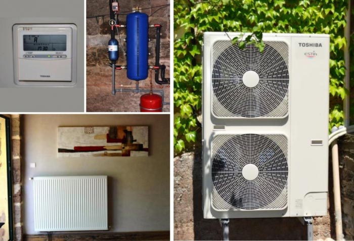 Installation d'une pompe à chaleur Toshiba et d'un réseau de radiateurs acier à eau chaude.